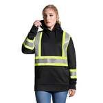 300 gsm – 8.9 oz./yd² – 14.7 oz./lin. yd 100% polyester one side brushed fleece with anti-pill, wicking, anti-bacterial and abrasion resistant finishes. Detachable hood with snaps and adjustable drawcord.    Kangaroo pocket with concealed pocket.  4” contrast hi-vis tape with 2” reflective tape on front and back body and sleeves.  Meets CSA standards.